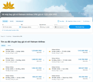 Sau khi điền đầy đủ thông tin, nhấn nút “Tìm kiếm”. Hệ thống sẽ hiển thị danh sách các chuyến bay Vietnam Airlines cùng với mức giá tương ứng.
